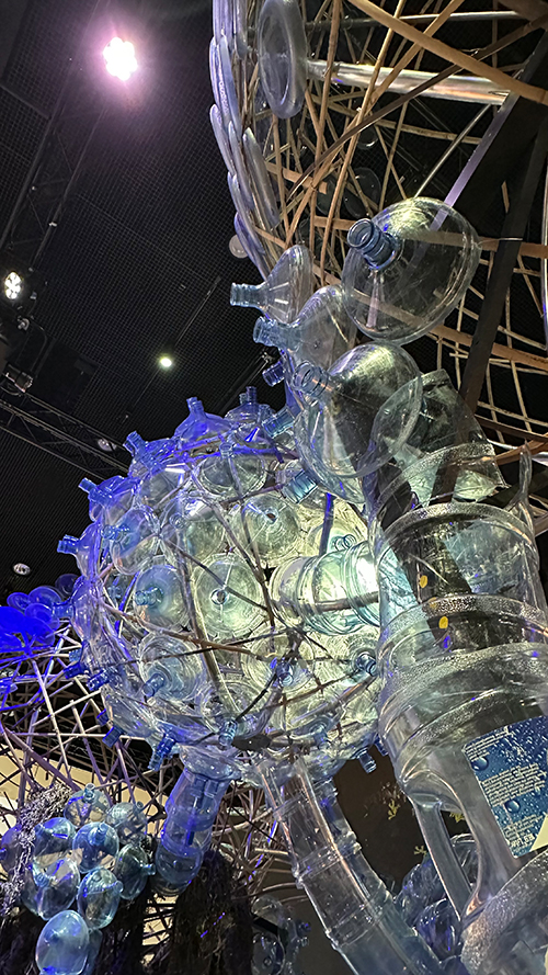 Zum großen Finale hin ging es dann wieder um die Flaschen. Mit „Ocean Futures“ eröffnete Ende 2025 das Futurium seine erste Sonderausstellung, gewidmet den weltumspannenden Meeren und ihrer Zukunft. Im Mittelpunkt stehen die Geschichten zweier Fischerfamilien – einer philippinischen und einer deutschen. Sie erzählen vom Leben am und mit dem Meer. Wie ein riesiges Meerestier verbindet die beeindruckende Installation des philippinischen Künstlers Leeroy New Vergangenheiten, Gegenwarten und Zukünfte miteinander. Und diese Arbeit wäre ohne die Plastikbehälter nicht möglich gewesen. Hier lohnt sich der Blick in die Foto-Galerie unten.