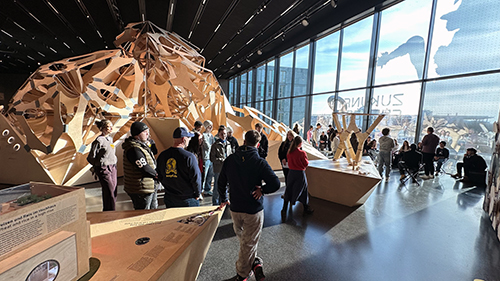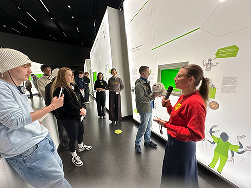 Die Frage war nun, was wird aus den Behältern? Es geht um Natur und dann wird Plastik gehortet? Um das zu ergründen, wurden wir zu einem Rundgang und Workshop im Museum nahe der Spree eingeladen. Zunächst begannen wir mit einer Tour durch die Ausstellung. Entlang vieler interaktiver Ausstellungsstücke wurde Fragen nach Zukunftstechnologien für Klimaschutz, Wohnen und Technik aufgeworfen. Interessant wurde es bei der Diskussion was die FMKUler im Umzugsunternehmen für mehr Arbeitssicherheit (z.B. Automatisierung im Lager, Nutzung von Exoskeletten) und Umweltschutz (Wiederverwertung von Materialien) leisten können.
